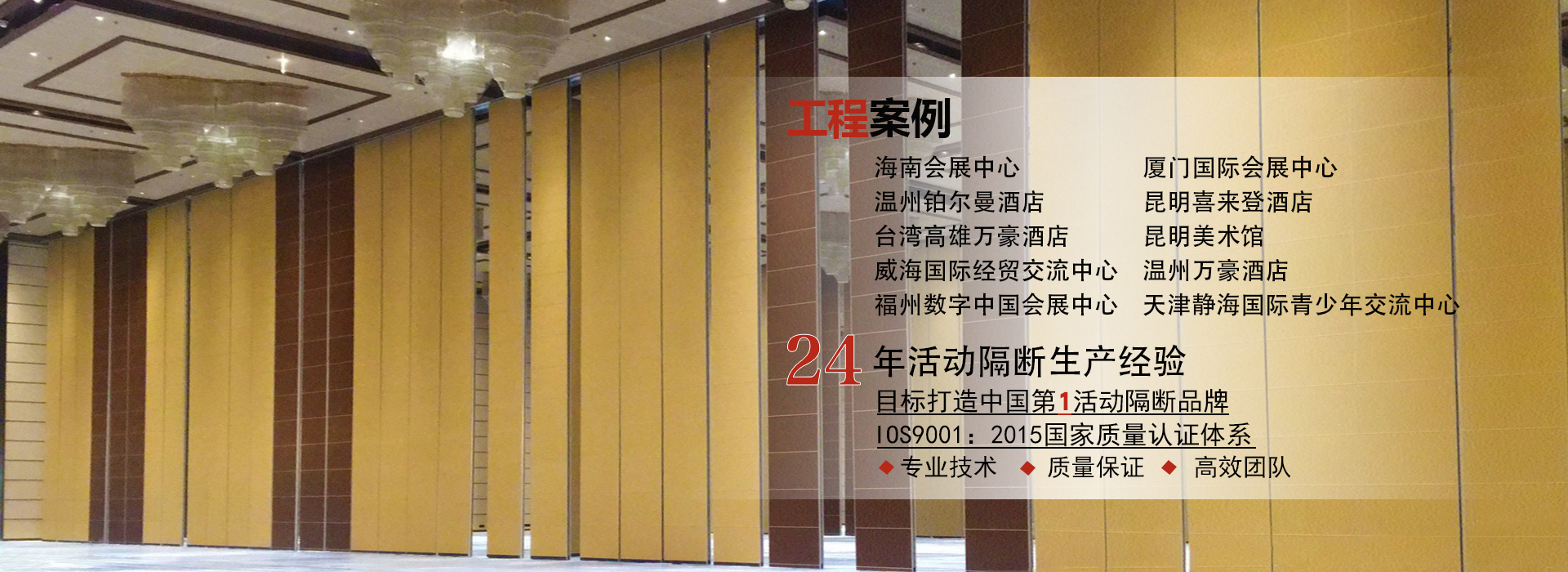 廣東一固隔斷制品有限公司成立于1998年,國家高新技術(shù)企業(yè),位于中國佛山市南海區(qū)里水鎮(zhèn),是一家專業(yè)從事活動(dòng)隔斷和辦公室玻璃隔斷系統(tǒng)開發(fā),銷售,生產(chǎn)和售后服務(wù)的一站式生產(chǎn)廠商。公司產(chǎn)品廣泛應(yīng)用于星級(jí)飯店,寫字樓,餐廳,宴會(huì)廳,會(huì)議中心或會(huì)展中心等商業(yè)場(chǎng)合,提供便捷有效的空間管理解決方案。最高門板高度可達(dá)20米,最大隔音系數(shù)可達(dá)56分貝。 一固公司擁有兩個(gè)現(xiàn)代化的生產(chǎn)基地,占地超過10,000平方米,...
